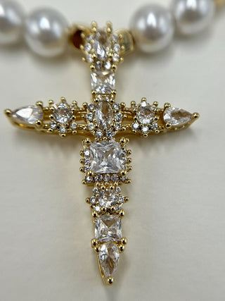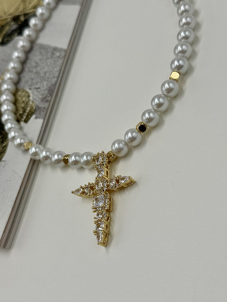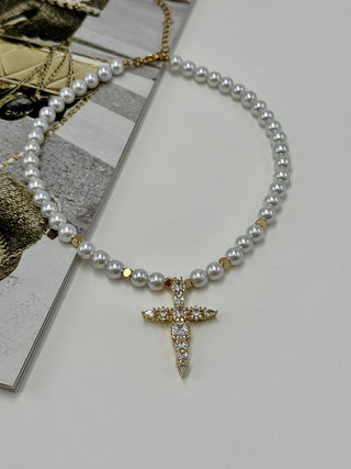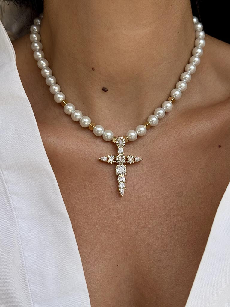 Χειροποίητο κολιέ με χάνδρες φίλντισι και εντυπωσιακό σταυρό διακοσμημένο με λαμπερά ζιργκόν. Το απόλυτο statement κομμάτι για κάθε στιγμή.