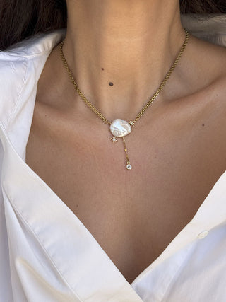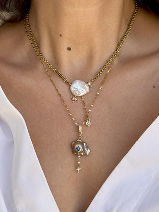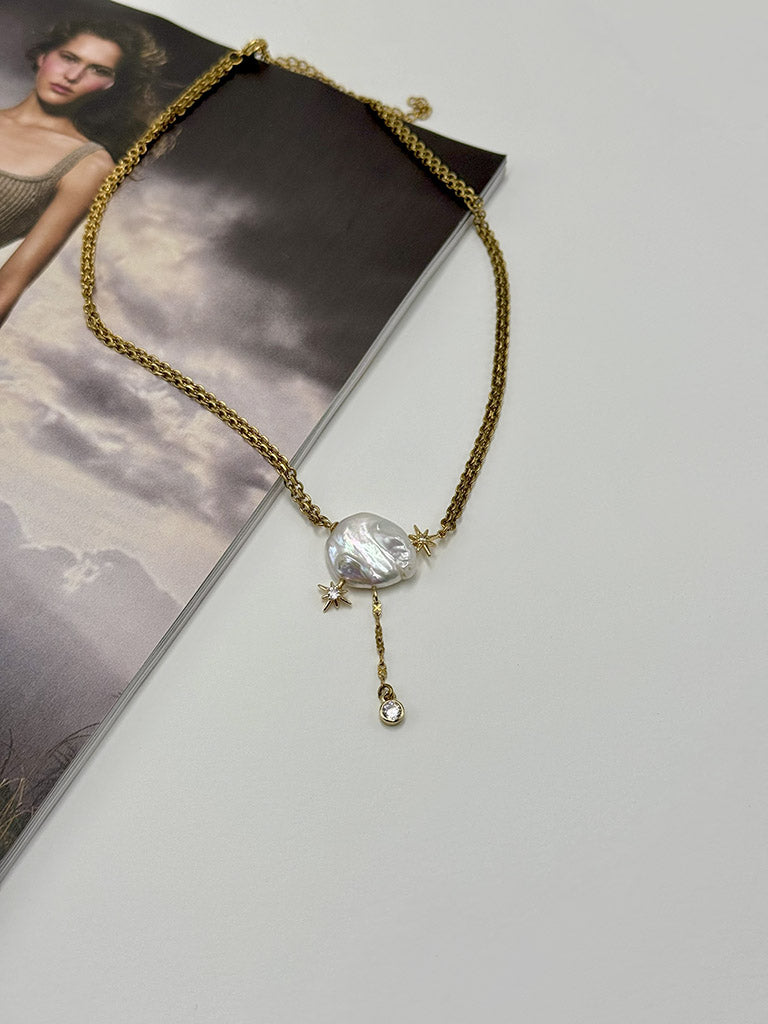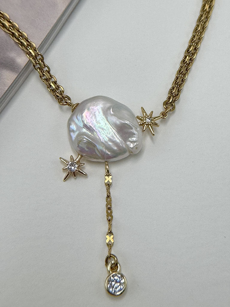 Ένα ξεχωριστό κόσμημα που κλέβει την παράσταση. Το φυσικό μαργαριτάρι Baroque, που θυμίζει αιθέριο σύννεφο, συνδυάζεται με χρυσή ατσάλινη αλυσίδα και λαμπερά αστεράκια με ζιργκόν, δημιουργώντας ένα μοναδικό ουράνιο σκηνικό. Ιδανικό για γυναίκες που αγαπούν τη φινέτσα και θέλουν να ξεχωρίζουν.