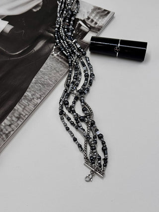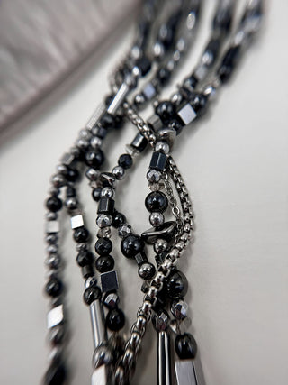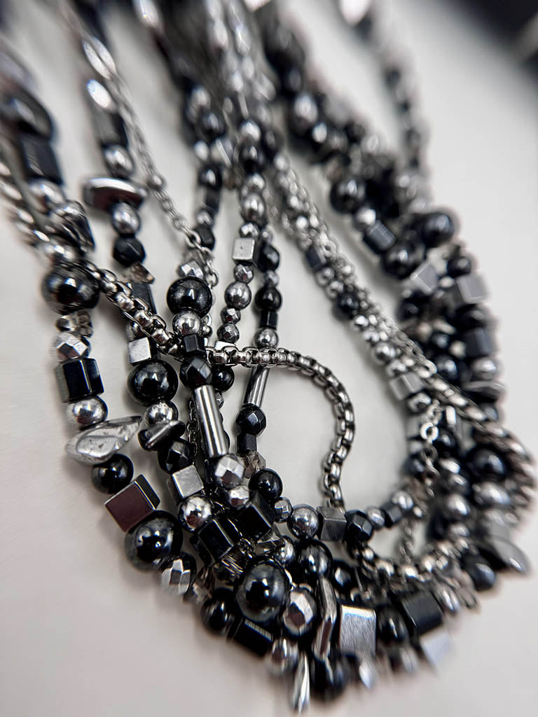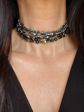 Εντυπωσιακό χειροποίητο τσόκερ με πόλλες σειρές από χάντρες αιματίτη και ατσάλινες αλυσίδες. Ο αιματίτης προσθέτει μια μεταλλική λάμψη που ταιριάζει με κάθε εμφάνιση, από πρωινή έως βραδινή.
