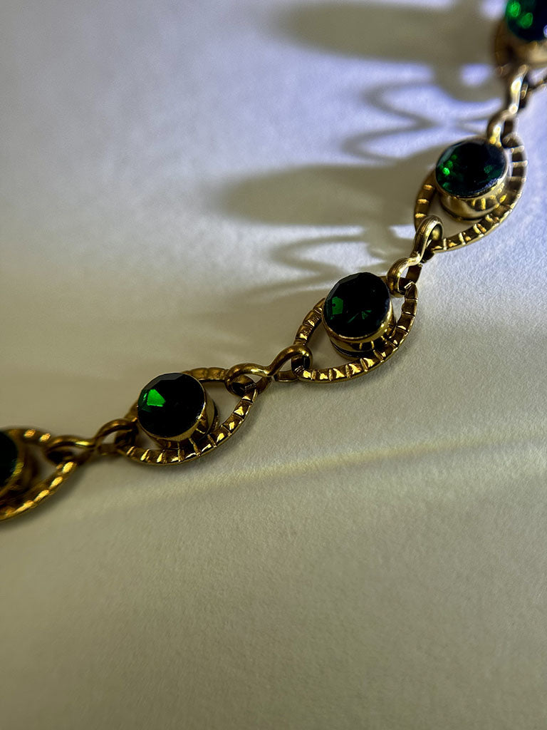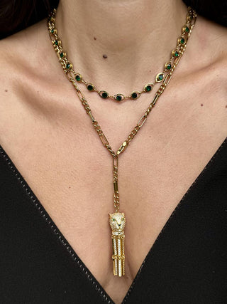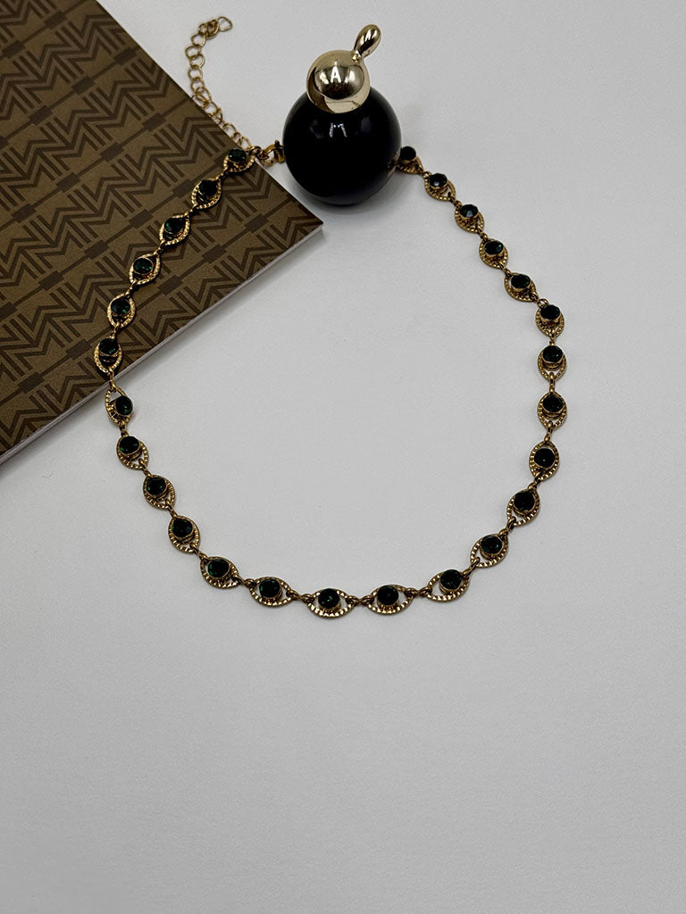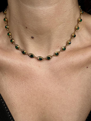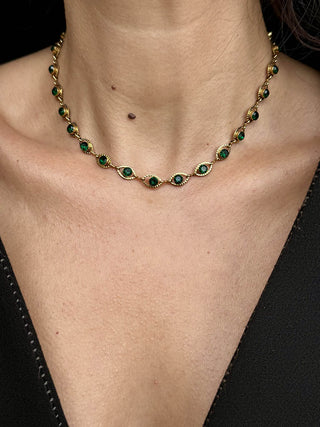 Κομψό κολιέ από ανοξείδωτο ατσάλι με πράσινα κρυστάλλινα “μάτια”, σε χρυσή βάση που χαρίζει λάμψη και πολυτέλεια. Ο elegant σχεδιασμός του αγκαλιάζει τον λαιμό διακριτικά, κάνοντάς το ιδανικό για minimal αλλά εκλεπτυσμένες εμφανίσεις. Ιδανικό για layering με άλλες αλυσίδες ή για να φορεθεί μόνο του ως elegant touch σε κάθε εμφάνιση.