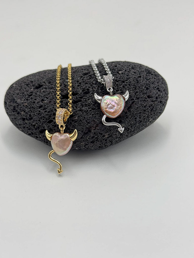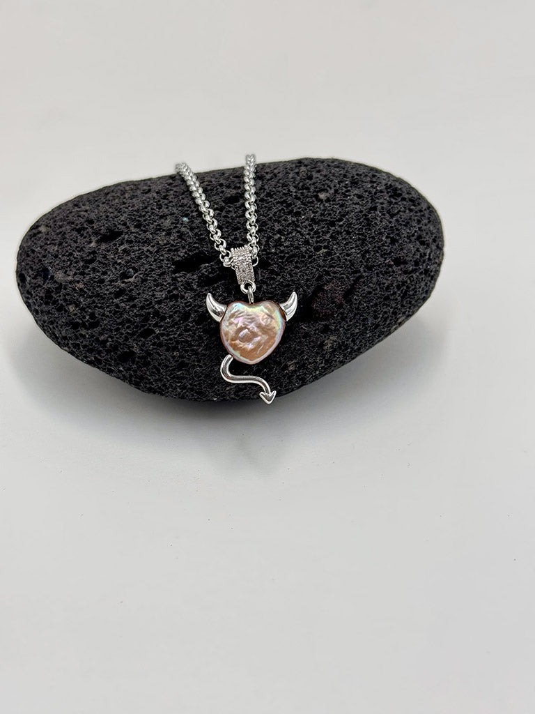 Μοναδικό χειροποίητο κολιέ με αλυσιδα από ανοξείδωτο ατσάλι και μαργαριτάρι γλυκού νερού καρδιά διαβολάκι σε ασημί χρώμα. Ένα σχέδιο που τραβάει την προσοχή!